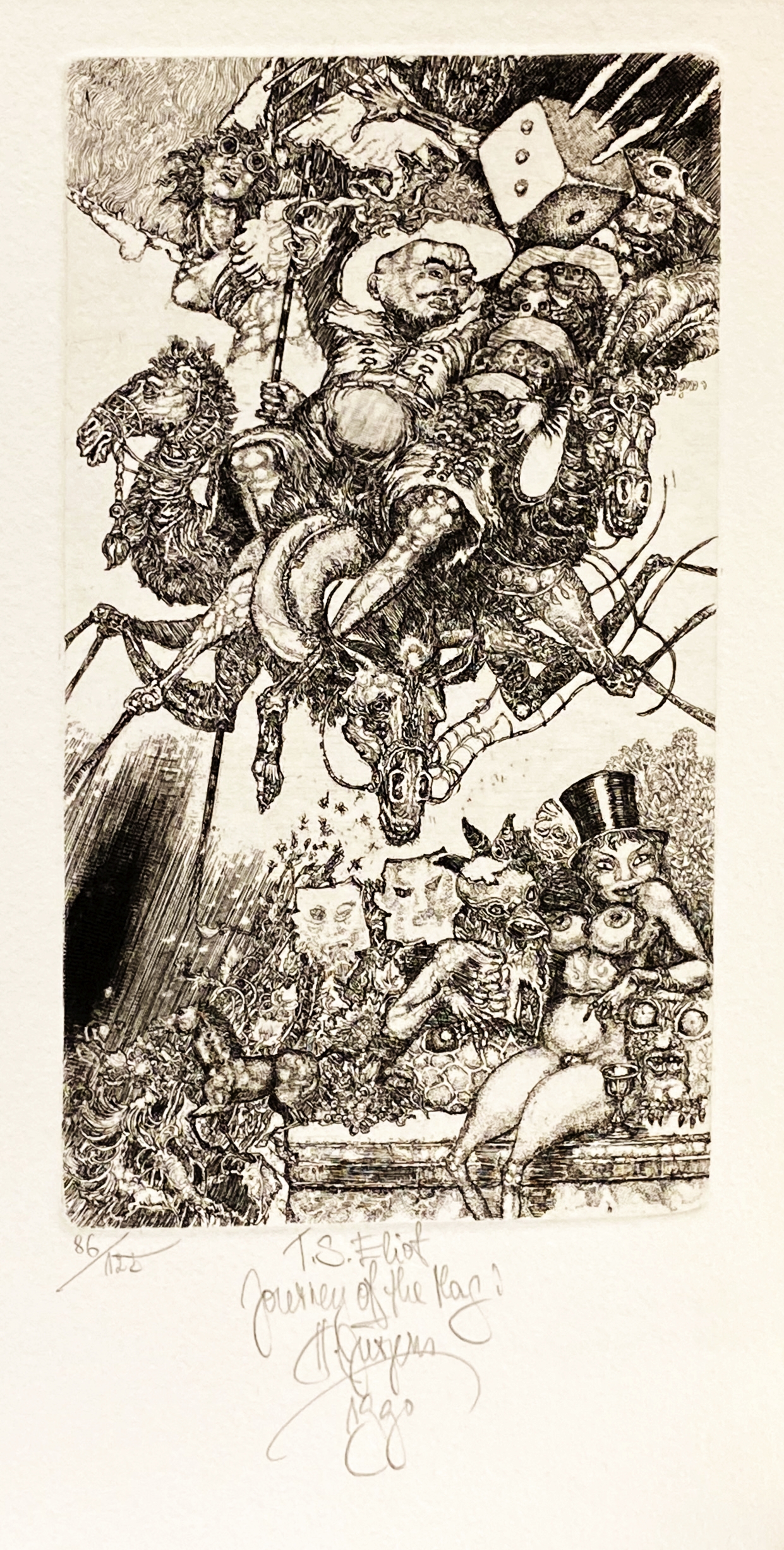 13. ELIOT, T.S. Journey of the Magi. (Vertaald door Bert Voeten, Peter Verstegen en Hugo Roeffaers). (Met vier gesigneerde etsen van Hedwig Pauwels, Harry Jurgens, Henryk Feilhauer en Zoltan Ven). Baarn, Arethusa Pers, 1991. Ingenaaid. 26 p. Met de hand gezet uit de Romanée en gedrukt door Johan de Zoete in een oplage van 100 genummerde exemplaren.
