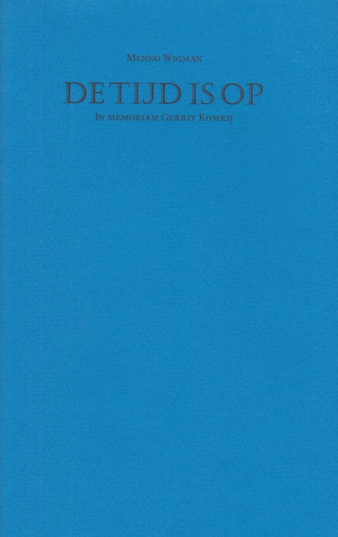 62. WIGMAN, Menno De tijd is op. In memoriam Gerrit Komrij. Woold-’t Harkel, De Uitvreter, 2012. Cahiersteek met omslag. (12) p. Met de hand gezet uit de Van Dijck en gedrukt in blauw en zwart op Simili Japon in een oplage van 60 genummerde en gesigneerde exemplaren. 1e druk.