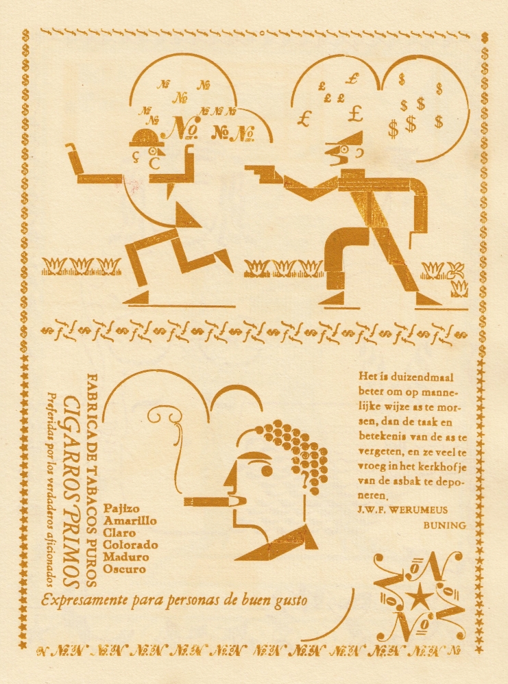 * Eigenlijk een kunstenaarsboek pur sang, waar maar liefst zes jaar aan gewerkt is. Het bestaat uit een negental prenten, waarvan het zetsel bestaat uit talloze ornamenten waarmee met tomeloze fantasie de meest fantastische voorstellingen zijn gemaakt. Het mag best wel eens gezegd worden: éen van de meest bijzondere Nederlandse bibliofiele uitgaven van de twintigste eeuw.