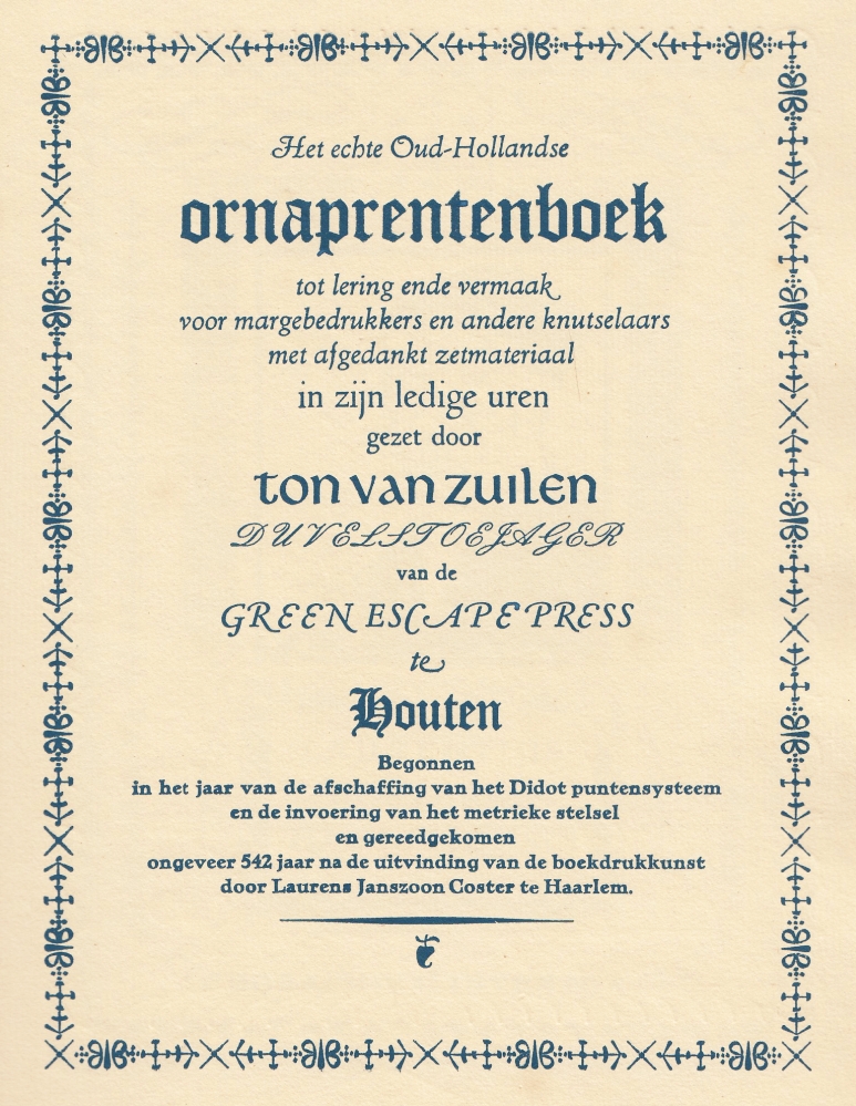 44. (MOESMAN, J.H., Als:) ZUILEN, Ton van Het echte Oud-Hollandse Ornaprentenboek. Tot lering ende vermaak van margedrukkers en andere knutselaars met afgedankt zetmateriaal in zijn ledige uren gezet door Ton van Zuilen, duvelstoejager van de Green Escape Press te Houten. Houten, Green Escape Press, [1982]. Cahiersteek. (12) p. Met de hand gezet en gedrukt in zes kleuren op negentiende eeuws papier in een oplage van 100 door J.H. Moesman (als ‘Ton van Zuilen’) en Henk van Otterloo gesigneerde exemplaren.