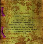58. VREDESPALEIS Note explicative sur la tenture de mur “Tsuzure-Nishiki” en drap de soie d’or aux dessins de fleurs et d’oiseaux, destinée à la décoration du Palais de la Paix à La Haye, oeuvre exécutée par la maison Kawashima Jimbei, fournisseur de la Maison Impériale, Kioto, Japon. Kyoto, Kawashima Jimbei, [1913]. 19 x 18 cm. Omslag van groene zijde met gouden bestempeling en zwarte letters, gemonteerd met paarse linten. 16 p. Met openklapbare prent in zwartwit. Gedrukt op Japans papier. 1e druk. Aan de kant van de snede wat gekreukt; staat iets open.