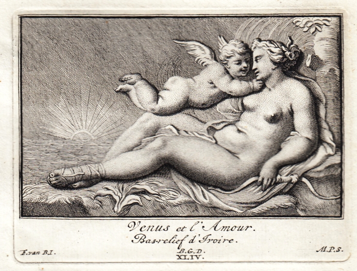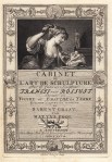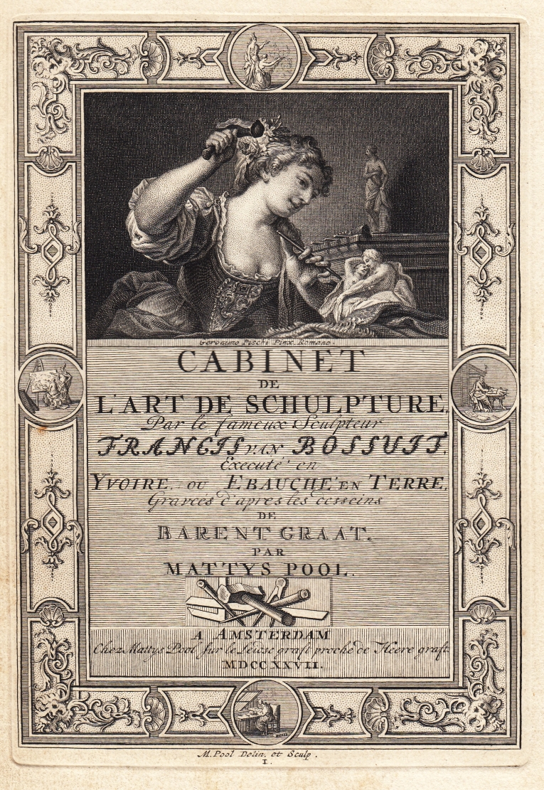 8. BOSSUIT, Francis van Cabinet de l’art de schulpture, par le fameux sculpteur Francis van Bossuit. Exécuté en yvoire ou ébauché en terre, gravées d’après les desseins de Barent Graat par Mattys Pool. Amsterdam, Mattys Pool, 1727. 28 x 20 cm. Halflinnen omslag (19e eeuw) met 85 losse bladen allemaal uitgevoerd in kopergravure: overzicht van de inhoud, twee titelpagina’s, opdrachtpagina, portret en levensbeschrijving van Bossuit, portret en levensbeschrijving van Graat, en 77 van de 89 gravures naar Bossuits sculpturen. (Enkele bladen bevatten twee prenten, de nummering is 9-103). Omslag versleten. De prenten zijn in goede staat, sommige iets verbruind aan de buitenste randen, maar niet in het beeld. Helaas is de inhoud incompleet, de volgende twaalf prenten ontbreken: 17, 18, 29, 32, 41, 43, 52, 64, 78, 80, 95 en 97.