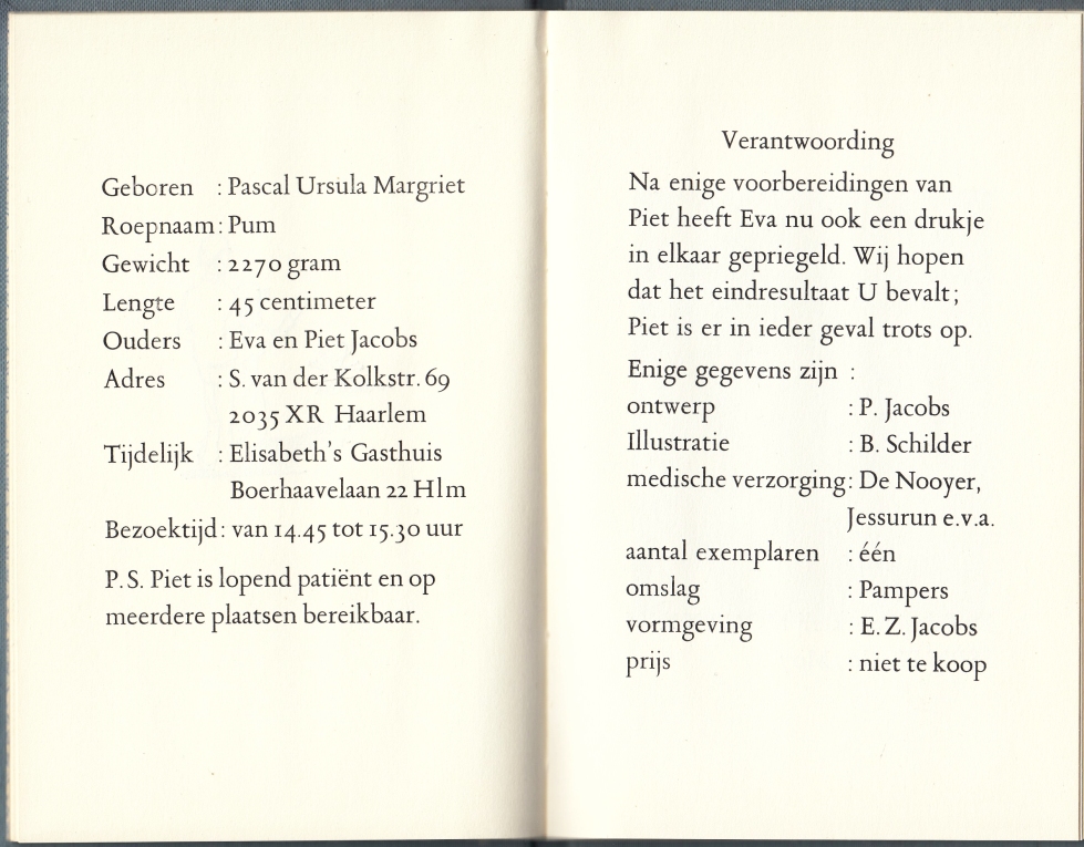 * Bijzonder grappig boekje met gevarieerde inhoud (o.a. een aantal kernachtige gedichten) dat cirkelt rond de geboorte van PUM ofwel Pascal Jacobs, de dochter van Piet en Eva. Dit is een van de 55 los verspreide exemplaren, mooi en professioneel gebonden door Jacobs – een van de laatste drukkers uit de aloude stal van Enschedé.