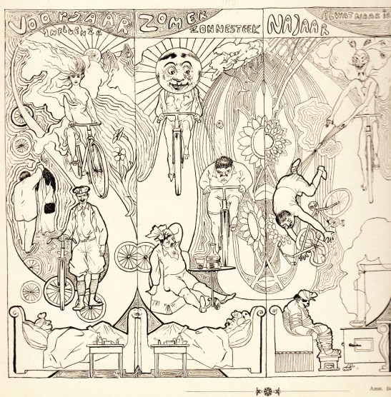 * Vermakelijke, gedetailleerde tekening, de oogst van een karikaturenwedstrijd van het weekblad De Amsterdammer. De in Zutphen geboren schilder (1868-1910), die zijn latere jaren in België doorbracht, maakte een schitterende kwartaalkalender waarin de lotgevallen van fietsers uit de doeken worden gedaan (‘Voorjaar: influenza / Zomer: zonnesteek / Najaar: (stormen) / Winter: Gansch van streek’).