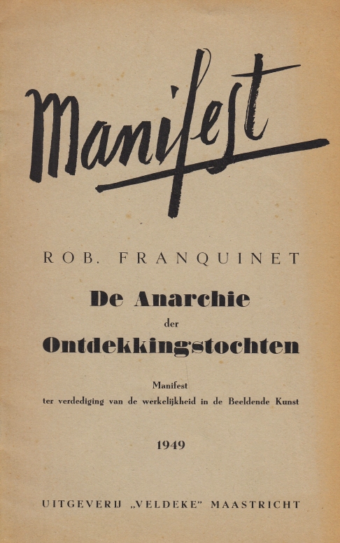 14. FRANQUINET, Robert De anarchie der ontdekkingstochten. Manifest ter verdediging van de werkelijkheid in de beeldende kunst. 1949. Maastricht, Uitgeverij Veldeke, 1949. Geniet. 16 p. 1e druk.