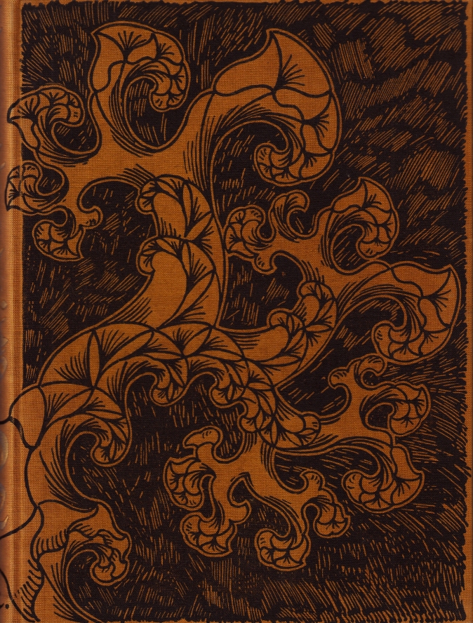 De vormgever is Mathieu Lauweriks (1864-1932), architect en ontwerper, tevens redacteur van het tijdschrift Wendingen. Alle tekstpagina’s zijn decoratief opgezet met tekstblokken die de vorm hebben van een boom. Alleen de geheel uit dikke rechte balkjes uit de drukkerij opgezette (en dientengevolge moeilijk te ontcijferen) titelpagina wijkt daarvan af. De aan Wendingen herinnerende schutbladen echoën de boomvorm met dikke grijze balken. Spectaculair is vooral Lauweriks’ bandontwerp: een zwarte plantaardige vorm op okerbruin linnen die zich in lichtere versie ook op het achterplat voordoet, en met een woeste en schier onleesbare rugtitel in goud. Dit boek, annex kunstvoorwerp met zijn duistere bezieldheid, is in uitstekende staat.