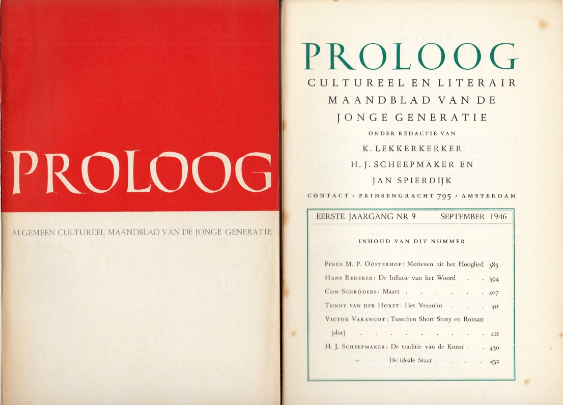 * Proloog stond onder redactie van K. Lekkerkerker, H.J. Scheepmaker en Jan Spierdijk. Later traden ook Hubert Lampo, Max Schuchart en Bert Voeten toe to de redactie. Het tijdschrift bevat werk van o.a. Bertus Aafjes, W.F. Hermans (voorpublicatie uit Conserve), A. Marja, Hanny Michaelis en Adriaan Morriën. Aflevering 10-11, een dubbelnummer, is geheel gewijd aan Slauerhoff en bevat o.a. ongepubliceerd werk, een artikel van W.F. Hermans, een afdeling ‘getuigenissen’ en een afdeling in memoriam-gedichten voor Slauerhoff.