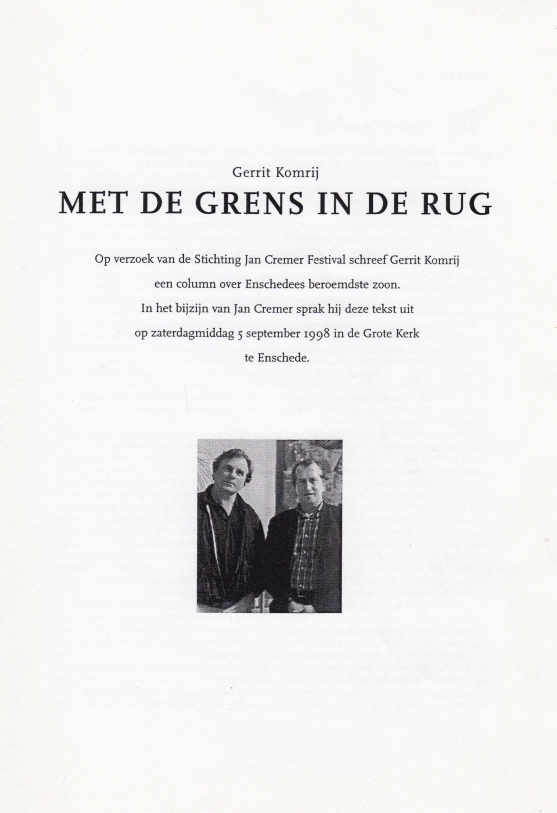 11. (CREMER, Jan). KOMRIJ, Gerrit Met de grens in de rug. Op verzoek van de Stichting Jan Cremer Festival schreef Gerrit Komrij een column over Enschedes beroemdste zoon. In het bijzijn van Jan Cremer sprak hij deze tekst uit op zaterdagmiddag 5 september 1998 in de Grote Kerk te Enschede. (Enschede, Jan Cremer Festival, 1998). Vouwblad. 29,5 x 21 cm.1e druk.
