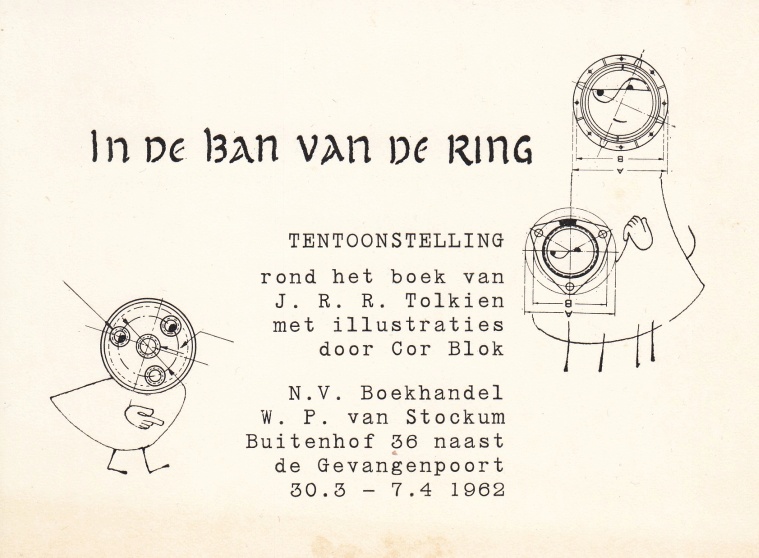 55. (TOLKIEN). BLOK, Cor In de ban van de Ring. Tentoonstelling rond het boek van J. R. R. Tolkien met illustraties van Cor Blok. [Den Haag], N.V. Boekhandel W.P. van Stockum, 1962. Uitnodigingskaart voor de expositie. Onderaan iets vergeeld.