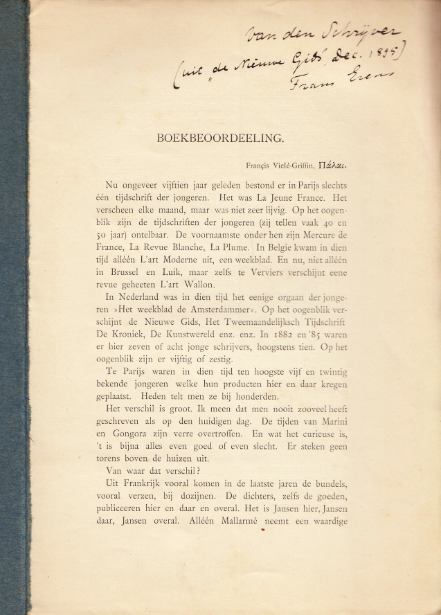 20. ERENS, Frans Boekbeoordeeling. Françis Vielé-Griffin, Palai. (En) Dr. Fastenrath, Columbus. Apart gepagineerde overdruk uit De Nieuwe Gids, december 1895. Ing. 8 p.