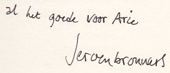 * Brouwers ging verhuizen naar Zutendaal. Met een kleine toevoeging in handschrift: ‘hartelijk gecomplimenteerd met uw plagiatenboek. Ik wens u het beste toe, Jeroen Brouwers’.