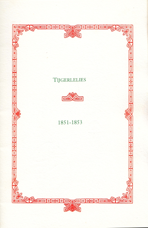 29. HAVERSCHMIDT, F., als: Piet PAALTJENS Tijgerlelies. (Met een originele aquarel van Katalin). Amsterdam, LJC-pers, 1993. 24 x 15 cm. Cahiersteek met omslag. (12) p. Gezet uit de Janson en gedrukt in een kleine oplage in groen en rood op handgeschept papier uit Transsylvanië.