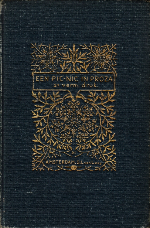 17. ERENS e.a., Frans Een pic-nic in proza. Amsterdam, S.L. van Looy, 1900. Versierd groenblauw linnen met goudopdruk (J.B. Heukelom). (8), 396 p. ‘Tweede veel vermeerderde druk’.