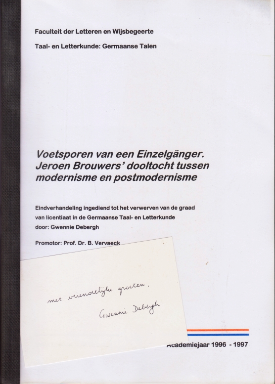 10. (BROUWERS, Jeroen). Gwennie DEBERGH Voetsporen van een Einzelgänger. Jeroen Brouwers’ dooltocht tussen modernisme en postmodernisme. Eindverhandeling ingediend tot het verwerven van de graad van licentiaat in de Germaanse Taal- en Letterkunde. Eigen beheer, 1997. garenloos in plastic omslag met linnen rug. 120 eenzijdig bedrukte p.