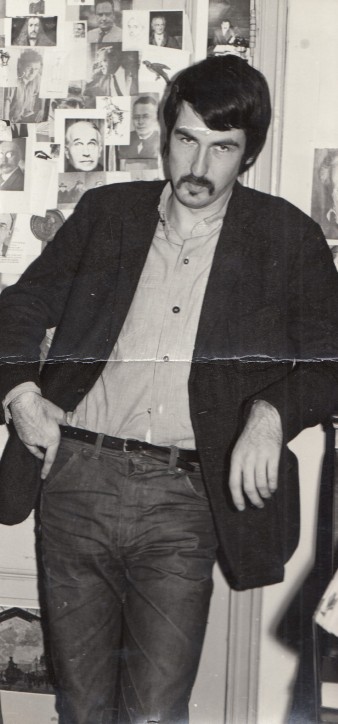 * Op de achterkant in potlood: ‘Pé Hawinkels op de studentenkamer van Michel van Nieuwstad (sic!) met op de deur foto’s van Bataille, D. Thomas, du Perron, Lenin e.a. In 1963′. We zien ook o.a. Dürer en Goethe.