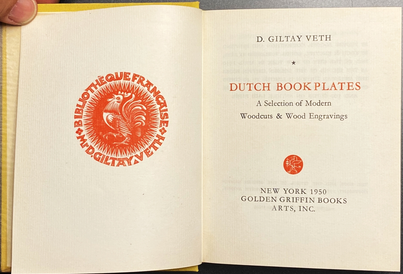 22. (ESCHER, M.C.). D. GILTAY VETH Dutch Bookplates. A Selection of Modern Woodcuts & Wood Engravings. New York, Golden Griffin Books, 1950. 14 x 11 cm. Linnen. 228 p. Met 84 exlibris, alle gedrukt van de blokken. Uitvoerige Engelstalige inleiding van Giltay Veth, waarin alle kunstenaars behandeld worden.