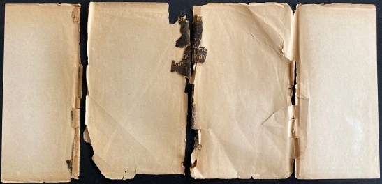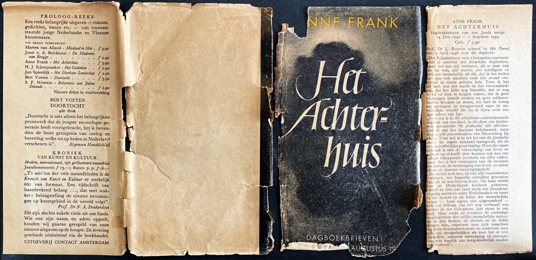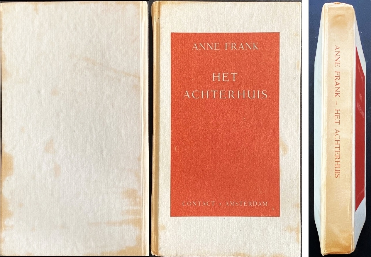 ANNE FRANK Het Achterhuis. Dagboekbrieven van 12 Juni 1942 – 1 Augustus 1944. Met een woord vooraf door Annie Romein-Verschoor. Amsterdam, Contact, (1947). Karton met stofomslag (ontwerp Helmut Salden). (2), X, 254 p. Geïllustreerd. 1e druk. Omslag aan de randen flink versleten en op de vouwen in drie delen gescheurd; de vouw tussen het achterblad en de laatste flap is nog nét niet helemaal door, maar de voorflap en de voorkant liggen allebei los. Op de vouwen zijn sommige stukjes papier naar binnen gevouwen; op de foto van de binnenkant van het omslag is te zien dat er van de beeldzijde méér bewaard is gebleven dan op het eerste gezicht lijkt. Het boek zelf is op de achterkant iets vlekkig, maar verder zeer gaaf.