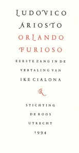 3. ARIOSTO, Ludovico Orlando Furioso. Eerste zang in de vertaling van Ike Cialona. Utrecht, Stichting De Roos, 1994. 17,5 x 9,5 cm. Karton. (4), 90 p. Typografie Bram de Does. Met de hand gezet uit de Romanée en gedrukt door Bram de Does in rood en zwart op een Victoria degelpers op Zerkall in een oplage van 175 genummerde exemplaren. Wat verkleurd.