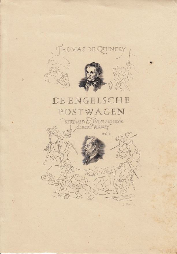 41. QUINCEY, Thomas de De Engelsche postwagen. Ingeleid en vertaald door Albert Verwey. (Met een koper- en houtgravure door S.L. Hartz). Utrecht, Stichting De Roos, 1952. 21 x 14 cm. Tweekleurig linnen. 84 p. Typografie en band S.L. Hartz. Gedrukt door Enschedé in een oplage van 175 genummerde exemplaren. Rug verbleekt. Zwart vlekje op prent.