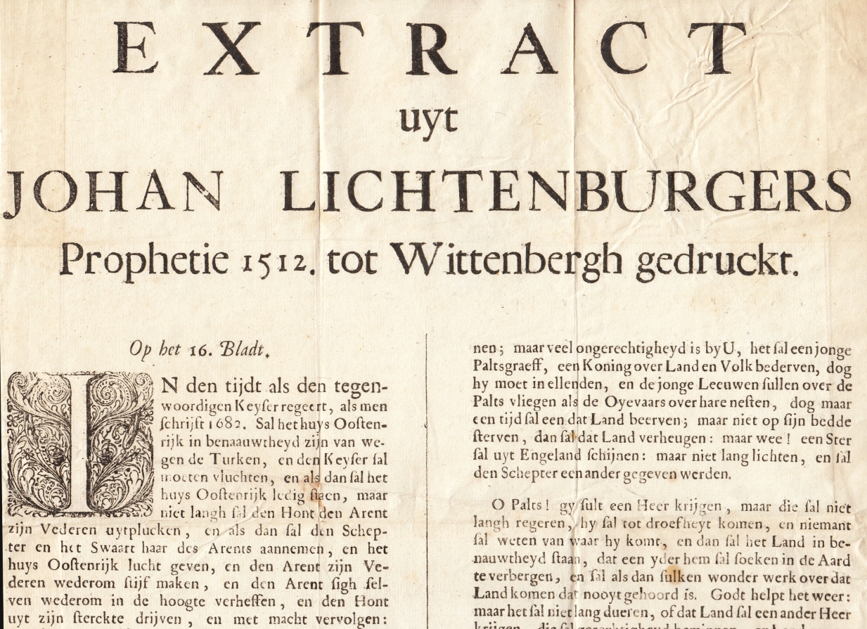 35. (LICHTENBERGER, Johann) Extract uyt Johan Lichtenburgers prophetie 1512. tot Wittenbergh gedruckt. Zonder plaats of uitgever, (1682). 34 x 30 cm. Plano. Gevouwen. Met een grote kapitaal I. Bijgesneden.