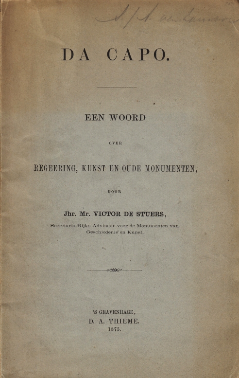 46. STUERS, Victor de Da Capo. Een woord over regeering, kunst en oude monumenten. Den Haag, D.A. Thieme, 1875. Ingenaaid. 96 p. Niet afgesneden. 1e druk. Wat verkleurd.