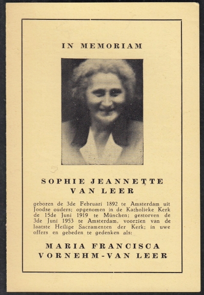 34. (LEER, Sophie Jeannette van) In memoriam Sophie Jeannette van Leer. (Origineel bidprentje). Gevouwen blad, 11,3 x 7,5 cm. Met foto voorop. Binnenin bijbelteksten.