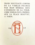38. MORÉAS, Jean Trois nouveaux contes de la Vieille France. Parijs, Émile-Paul Frères, 1921. Ingenaaid. 102 p. Gedrukt in 1717 genummerde exemplaren. Niet afgesneden. 1e druk/ édition originale. Iets verkleurd, enkele roestvlekjes, omslag wat stoffig.