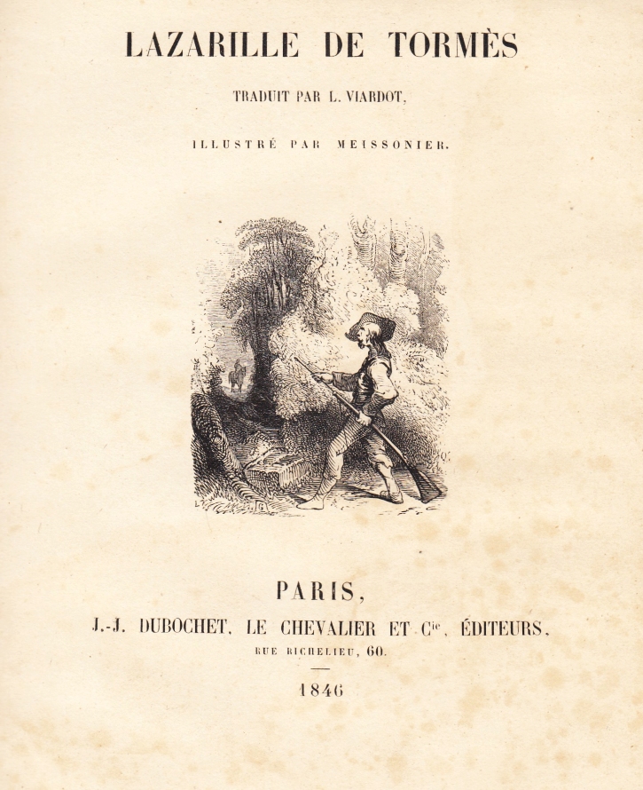 33. LAZARILLO DE TORMES Histoire de Lazarille de Tormès. Traduit par L. Viardot. Illustré par Meissonier. Parijs, Dubochet & Chevalier, 1846. 26 x 18 cm. Linnen met rugschildje. Gemarmerde platten. (46) p. Alle pagina’s met rood kader. Band wat dof.