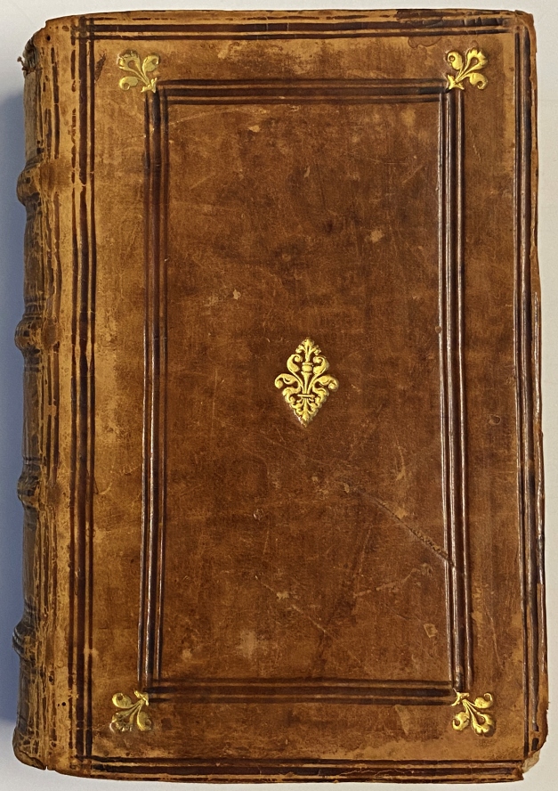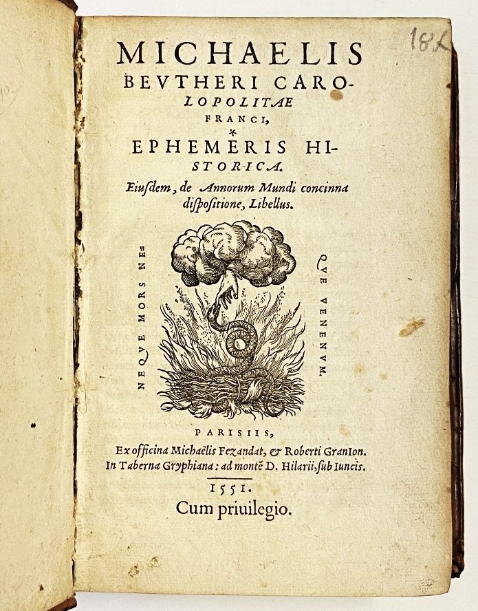 7. BEUTHER, Michael Ephemeris historica. Eiusdem, de Annorum Mundi, concinna dispositione, Libellus. Parijs, Michael Fezandat & Robert Granjon, 1551. Kalfsleren band met vier ribben, waarop mogelijk later kaders en vignetten in goud en blindstempel zijn aangebracht. Sneden gepolijst. (16), 433, (15); (176) p. 1e druk. Enige slijtage en verbleking aan de rug, donkere vlek achterop. Schutbladen ontbreken. Wat inktvegen, maar zonder inscripties. Ingeplakte beschrijving van dit exemplaar uit een oude Beijers-veiling (jaren 1970).