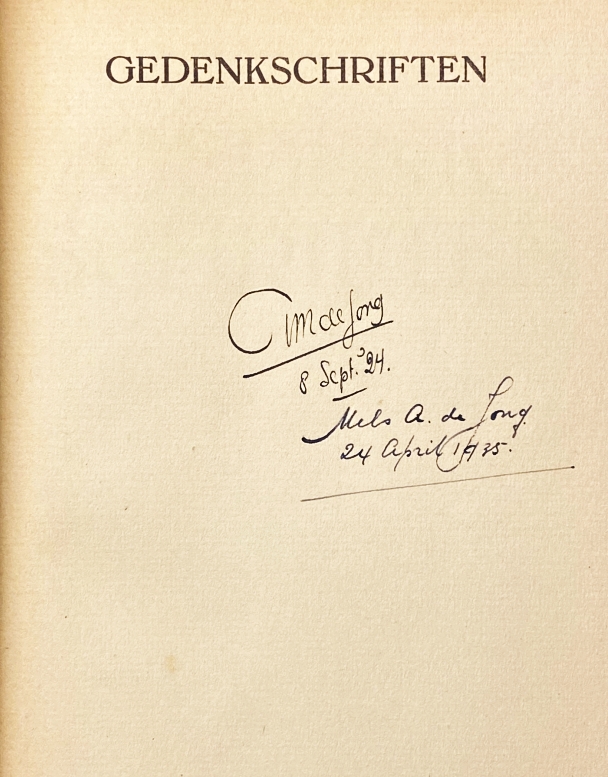 * Op de Franse titel de handtekening van de schrijver A.M. de Jong (1888-1943) met datum ‘8 Sept. ’24’, met daaronder die van zijn in 1916 geboren zoon: ‘Mels A. de Jong/ 24 April 1935’. Van A.M. de Jong verscheen in Het Volk van 20 september 1924 een waarderend artikel over Van Deyssel, waarin hij zich echter teleurgesteld betoonde over de Gedenkschriften.