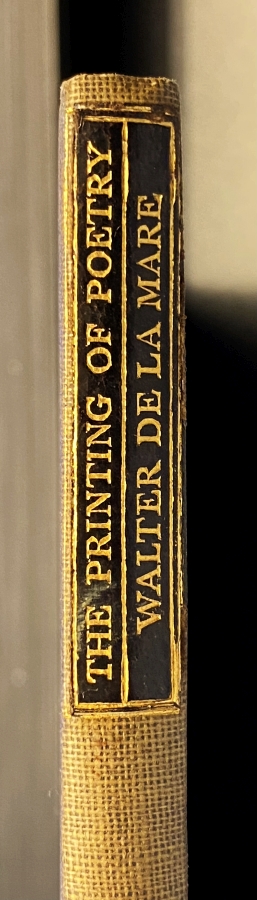 21. DE LA MARE, Walter The Printing of Poetry. A paper read before the Double Crown Club, London 12 February 1927. Cambridge, University Press, 1931. 16 x 11 cm. Linnen met mooi lederen rugetiketje. (2), 34 p. Gedrukt op geschept papier in 90 genummerde exemplaren. 1e druk. Rug verbleekt.