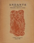 37. MEYLAND, Frank Andante. (Met handgeschreven opdracht). Brugge, N.R.B. Vlaanderen, 1942. Ingenaaid. 48 p. Gedrukt in 150 genummerde exemplaren. Met een lino van Max Damme. 1e druk. Rugje versleten.