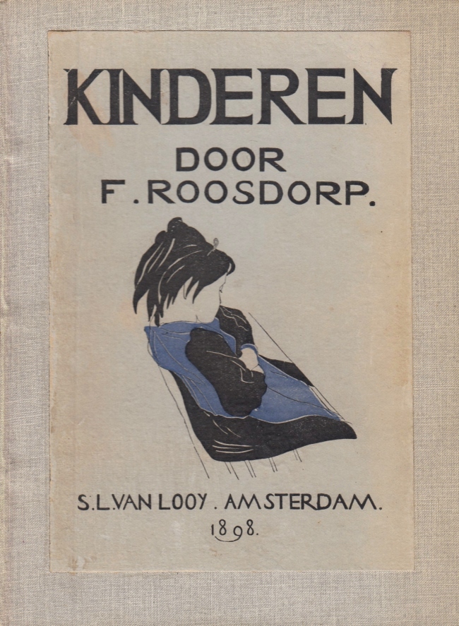 51. ROOSDORP, Frits Kinderen. Amsterdam, S.L. van Looy, 1898. Contemporain linnen met opgeplakt deel van het origineel omslag (naar een houtsnede van C.A. Lion Cachet). (8), 80 p. 1e druk. Enkele verwijderde oude stempels. Naam op titel van ‘Bep de Clercq/ 1918’. Aantekening van Andries Munnichs over Frans Erens in potlood.