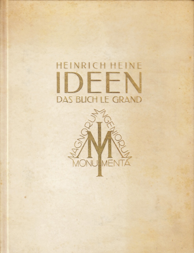 29. HEINE, Heinrich Ideen. Das Buch Le Grand. Amsterdam-Mechelen, De Spieghel-Het Kompas, 1930. 23 x 18 cm. Heelperkament met goudopdruk. 96 p. Kop verguld. Niet afgesneden. Gedrukt in 250 genummerde exemplaren op velijnpapier van Pannekoek Van Gelder. Band wat vergeeld, staat iets open.