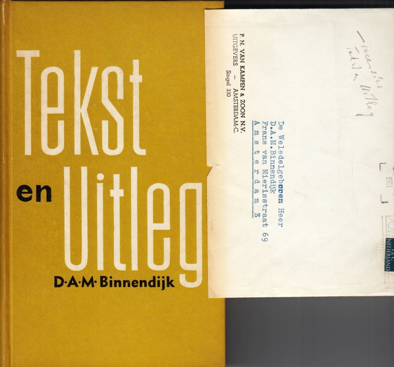 * Auteursexemplaar met vier knipsels in aan Binnendijk geadresseerde envelop, waarop in diens handschrift ‘recensies Tekst en Uitleg’.