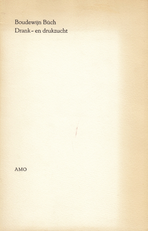 18. BÜCH, Boudewijn Drank- en drukzucht. (Met een originele ets van Peter Yvon de Vries). Amstelveen, AMO, 1985. Ingenaaid met omslag. (8) p. Met de hand gezet uit de Erasmus en gedrukt door Peter Yvon de Vries op Van Gelder in een oplage van 35 door de auteur genummerde en gesigneerde exemplaren. 1e druk.