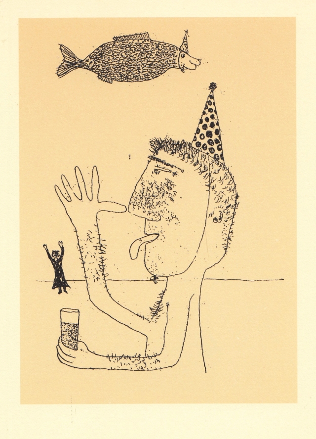 * Originele collage, gebaseerd op een houtsnede van Richard Bong (1853-1935): het lijkt alsof er een vrouw naar de heksenwaag wordt geleid, opgewacht door mannen met dierengezichten. Of zijn het drie prelaten die in een ton helwaarts zinken, gadegeslagen door vrouwen en apenkoppen? Jan Bernhard Meinen (1945-2001) werd onder meer bekend van de illustraties bij De Verschrikking van Gerrit Komrij.