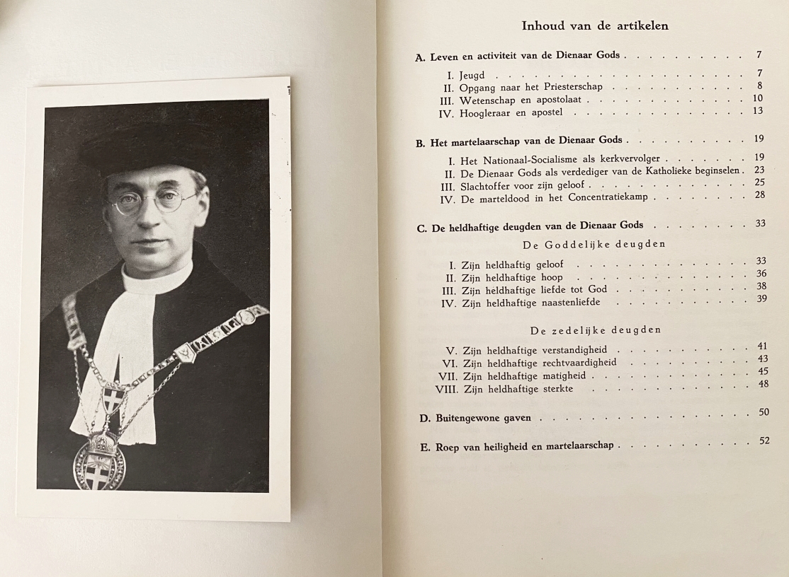 * Herdenking van de dood van Titus Brandsma in Dachau. Met inliggende portretkaart van Brandsma. Bijgevoegd: Louis FREQUIN, Wie is Titus Brandsma? (2e druk, 1981); Titus BRANDSMA, Geert Groote. Zijn keer naar de Heer. (1981); Titus BRANDSMA, Mijn cel en Dagorde van een gevangene (1944), en Het laatste geschrift van Prof.Dr. Titus Brandsma (2e druk, december 1944). Informatieve publicaties over de Nederlandse heilige.