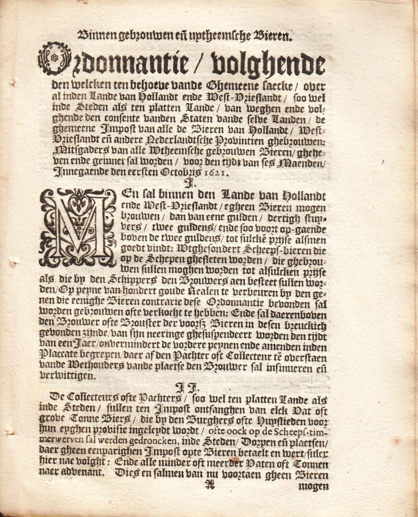 2. BIER Ordonnantie volghende den welcken ten behoeve van de Ghemeene saecke over al in den Lande van Hollandt ende West-Vrieslandt soo wel inde Steden als ten platten Lande van weghen ende volghende den consente vanden Staten vande selve Landen de ghemeene Impost van alle de Bieren van Hollandt West-Vrieslandt en andere Nederlandtsche Provintien ghebrouwen: Mitsgaders van alle Wtheemsche gebrouwen Bieren gheheven ende geinnet sal worden voor den tijdt van ses Maenden Innegaende den eersten Octobris 1621. Zonder plaats of uitgever, 1621. Zonder omslag, zoals uitgegeven, met naaigaatjes, maar draad ontbreekt. 20 p. Houtgesneden initialen O en M voorop. Blanco, invulregels achterin niet ingevuld. Zeer gaaf.
