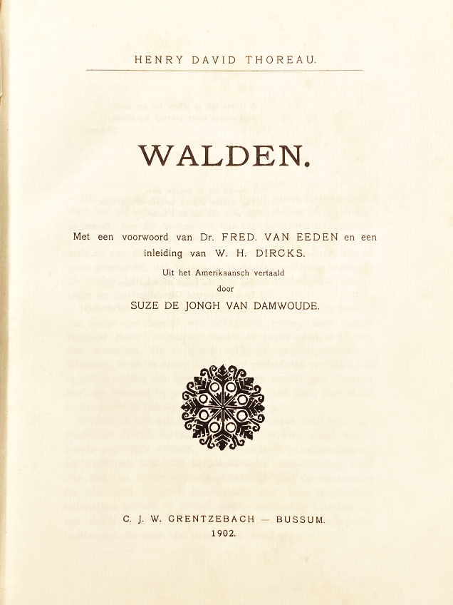 17. (EEDEN (inl.), Frederik van). THOREAU, Henry David Walden. Met een voorwoord van Dr. Fred. van Eeden en een inleiding van W.H. Dircks. Uit het Amerikaansch vertaald door Suze de Jongh van Damwoude. Bussum, Grentzebach, 1902. Halflinnen (latere band van J. Emmering). (8), 380 p. 1e druk. Rug nogal donker geworden, platten iets gevlekt, verder mooi.