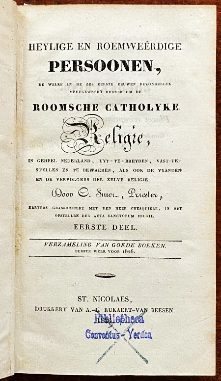 44. SMET, Cornelis Heylige en roemweêrdige persoonen, de welke in de zes eerste eeuwen bezonderlyk medegewerkt hebben om de Roomsche Catholyke religie, in geheel Nederland, uyt-te-breyden, vast-te-stellen en te bewaeren, als ook de vyanden en de vervolgers der zelve religie. St. Nicolaes, A.-L. Rukaert-van Beesen, 1826. één band. Met register. Twee delen in Half kalfsleer met gemarmerde platten. (8), IV, 294; (4), 298 p. Herdruk. Oude bibliotheekstempels uit Alverna en Verdon. Mooi.