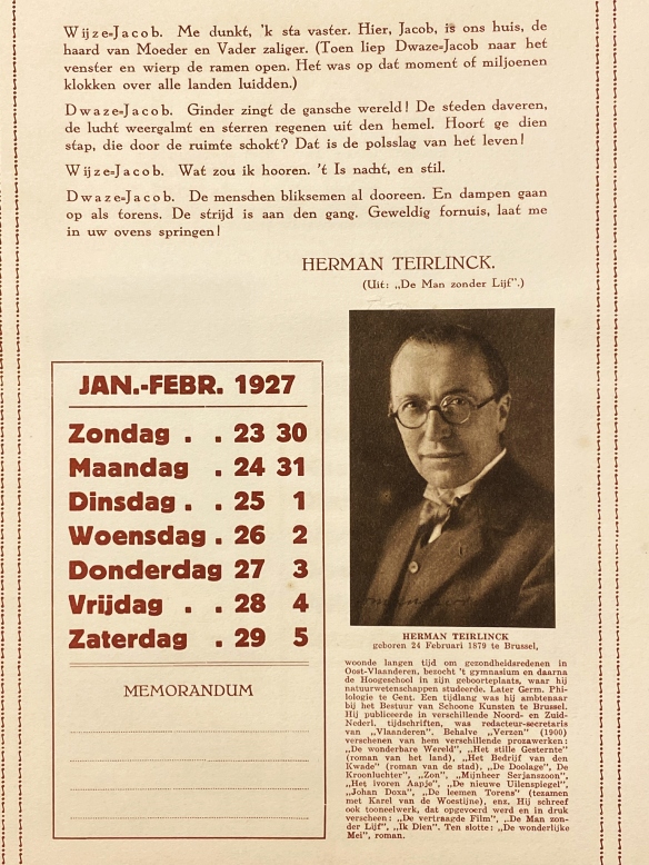 * Vooral wat minder bekende auteurs, veelal Nederlanders en enkele Vlamingen: o.a. Frans Erens, Jan Walch, Jacob Winkler Prins, Herman Teirlinck, Adama van Scheltema, P.H. van Moerkerken, het echtpaar Scharten, Frans Bastiaanse, M.J. Brusse, M.H. van Campen, Henri van Booven, Frans Erens, Cyriel Buysse, Augusta Peaux, Henri Dekking en Jacob Israël de Haan. Complete kalenders als deze zijn schier onvindbaar.