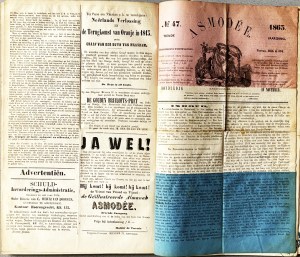 3. ASMODÉE Asmodée. 10e jaargang nr.1-53 (compleet). Amsterdam, Mulder II, 1863. Herbonden in eenvoudig halflinnen. (112) p. Enkele illustraties (vignetten). 1e druk. Buitenste nummers gekreukt en soms met plakband gerepareerd. Enkele nummers deels gescheurd, maar compleet.