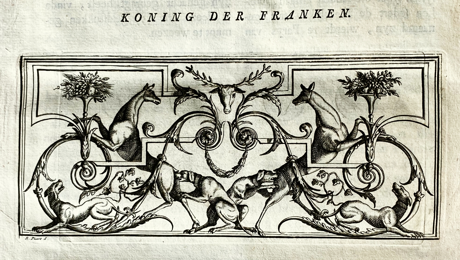 Deel 1: Met titelprent, frontispice en gegraveerd wijdingblad, drie dubbelbladige prenten en zes enkelbladige; vier stambomen (geslachtslijsten) op dubbele bladen en 12 dubbelbladige kaarten. Deel 2 heeft 17 geslachtslijsten (geen overbodige luxe in deze tekst, een gedetailleerde geschiedenis van het Jutlandse, Karolingische, Saksische, Luxemburgse en Ottoonse vorstenhuis en andere geslachten uit de vroege middeleeuwen, een kaart, drie prenten in verschillende formaten, benevens een (identiek) frontispice. Daarbij ook een grote, gedetailleerde gravure aan het begin van de tekst. Beide boeken hebben vele kleine gravuurtjes van munten en penningen in de tekst plus levendige in koper gegraveerde kop- en sluitvignetten. 1e druk. De boekbanden zijn versleten en het naaisel is wat los. Groot papier, niet afgesneden, met brede marges, sommige bladzijde-uiteinden wat versleten. In deel 2 rond p. 170 en rond p. 180 flinke bruine vlekken in de tekst, en een naam in potlood (‘Juffr. Klerbeert’).