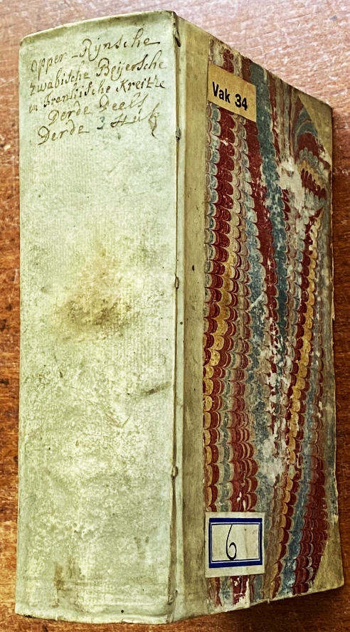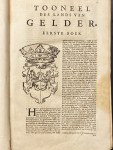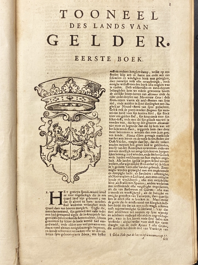 42. SLICHTENHORST, Arend van XIV boeken van de Geldersse geschiedenissen. Van ’t begin af vervolghd tot aen de afzweeringh des konincx van Spanien; waervan ’t eerste Deel verhandeld de landbeschrijvingh. Getrocken meerendeels uyt de Latynsse werken van den heer Ioh. Isacus Pontanus; doch doorgaens veranderd, verbeterd, ende met meer dan driehonderd nieuwe hoofd-stucken, en andere noodelyke bijvoeghsels, allesins vergroot. Arnhem, Iacob van Biesen, 1653. Halfleer uit de tijd (rug geschaafd, bovenaan de rug hangt een stuk leer los (maar het is er wel), gat in het midden van de rug). (16), 116, (4), 596, (24) p. Sommige pagina’s in het eerste boek zitten los (waarschijnlijk omdat de prenten eruit zijn gehaald). 1e druk.