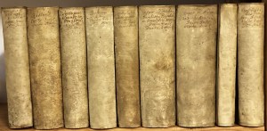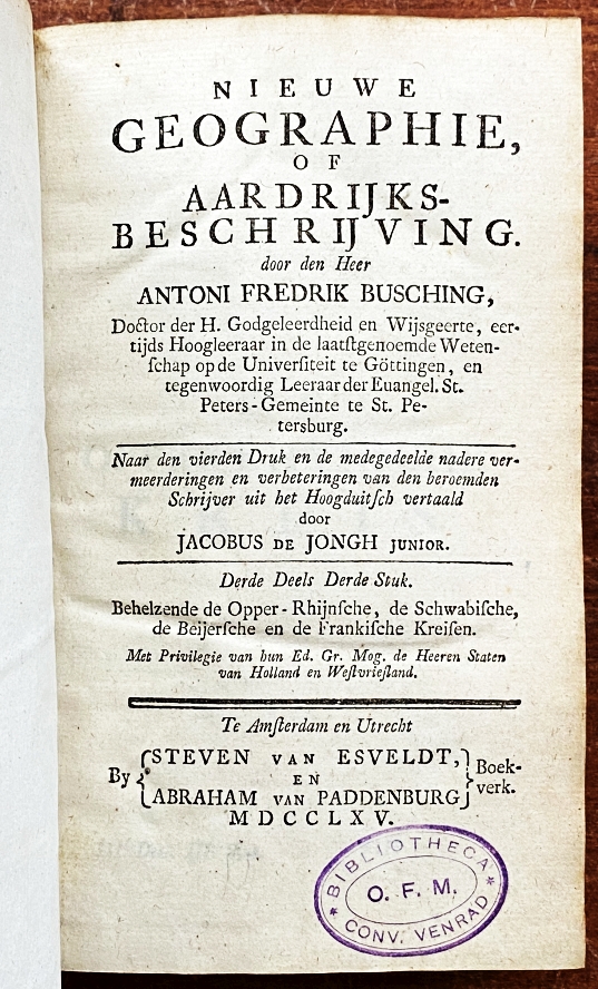 8. BUSCHING, A.F. Nieuwe geographie, of aardrijksbeschrijving. Naar den vierden druk (…) uit het Hoogduitsch vertaald door Jacobus de Jongh junior. Den Haag/ Amsterdam/ Utrecht, Van Thol/ Van Esveldt/ Van Paddenburg, 1761-1770. Negen delen (van twaalf). Halfperkament met gemarmerde platten uit de tijd. Ruim 4500 p. Stempel (van een kloosterbibliotheek) op titelpagina’s. Kaarten ontbreken. Decoratieve, uniform gebonden serie.
