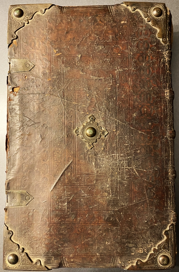 18. FLAVIUS JOSEPHUS Flavii Iosephi hooghberoemde Joodsche historien ende boecken. Noch Egesippus Vande ellendighe verstoringe der stadt Ierusalem. [Amsterdam, Jan Evertsz. Kloppenburgh, 1636]. Gedrukt in Zwolle in 1634 door Frans Iorriaensz. en Ian Gerritsz. Contemporain blindgestempeld heelleder over dikke houten platten. Koperbeslag op de hoeken (twee van de acht ontbreken), twee koperen middenstukken en twee sloten (leren sluitbandjes ontbreken). (1), 338, (13), 77, (4) bladen. Met 103 teksthoutsneden, die worden toegeschreven aan Christoffel van Sichem II. Titelpagina ontbreekt.