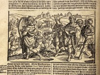 * Matig exemplaar: scheur aan buitenkant voorste kneep (op de rug, niet los). leer boven de bovenste rib ontbreekt, titelpagina ontbreekt, watervlekkig, eerste en laatste pagina’s langs randen beschadigd, sommige pagina’s los en/of vuil. (Van de vijf exemplaren die in de STCN worden beschreven ontbreekt bij drie eveneens de titelpagina). Toch mooi en decoratief, met álle vertaalde tekst van Flavius Josephus, met prachtige, dichtbevolkt-renaissancistische houtsneden geïllustreerd.