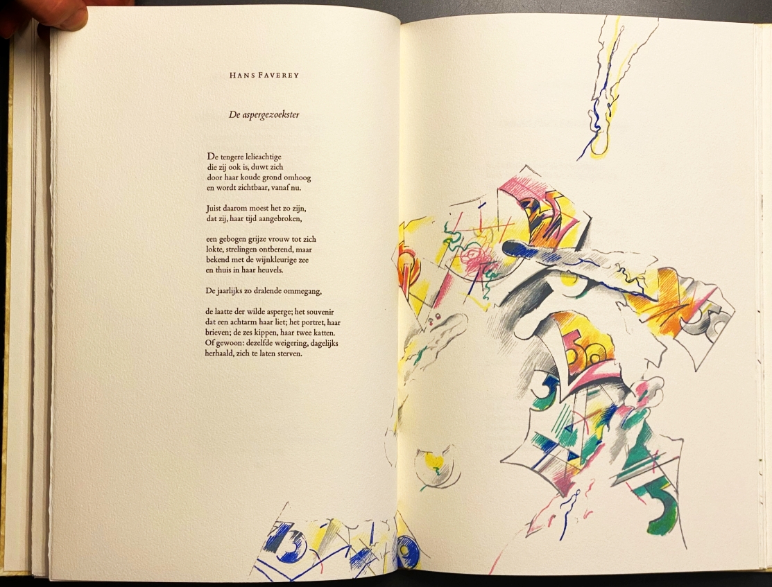 Oogverblindende uitgave waarin de supergroente ASPERGE centraal staat! De zes paginagrote, veelkleurige illustraties van Pierre van Soest (waarvan er twee twee pagina’s beslaan) zijn in zeefdruk uitgevoerd; de eerste litho is door de kunstenaar met de hand bijgewerkt. Elf dichters (zeker niet de minsten!) schreven speciaal voor deze uitgave een gedicht over de asperge. In volgorde van opkomst lezen wij verzen van Hugo Claus, Manuel Kneepkens, Hans Faverey, Jan G. Elburg, Gerrit Kouwenaar, Frans Budé, Rutger Kopland, Hans van de Waarsenburg, Bert Schierbeek, Wiel Kusters en Cees Nooteboom.