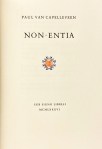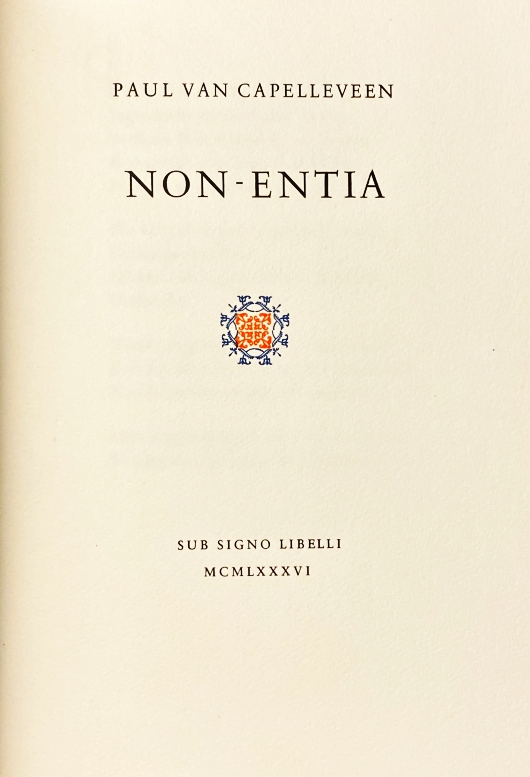 3. CAPELLEVEEN, Paul van Non-entia. Sub Signo Libelli, 1986. Halfperkament met changeant zijden opgelegde platten (Binderij Phoenix). (20) p. Met de hand gezet en gedrukt in blauw, rood en zwart in een oplage van 54 exemplaren. 1e druk.